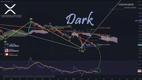 een nieuwe update stelt Dark Defender dat XRP op de 3-daagse grafiek boven een dalende weerstandslijn is uitgebroken, nadat de koers meerdere keren steun vond rond $1,31.
