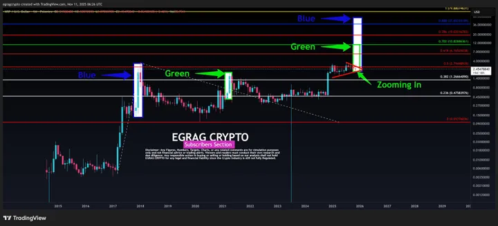 Hij rekent op wave 3 voor een enorme sprong, met cyclusdoelen van $15 tot $30. Historisch klopt het: langere consolidatie leidt tot sterkere breakouts.