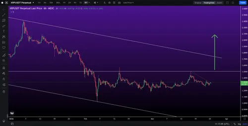 De onderliggende gedachte achter deze setup is technisch goed te volgen. XRP beweegt al langer in een structuur waarin de koers onder weerstand samenknijpt. Zulke fases van compressie eindigen vaak in een grotere beweging, omdat kopers en verkopers steeds dichter op elkaar komen te zitten.