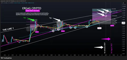 In dat model draait het om Fibonacci-extensies, eerdere marktcycli en bredere projectieniveaus. Op basis daarvan komt Egrag uit op mogelijke doelzones die veel verder liggen dan de huidige koers. In het meer behoudende scenario gaat het om een beweging richting ongeveer $8, terwijl de grotere structurele projecties oplopen tot grofweg $21 tot $27.