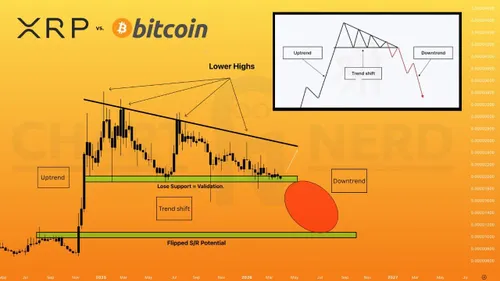 Omdat XRP dat niveau eerder niet wist te breken en daarna meer dan 55 procent terugviel naar ongeveer $1,35, ziet Martinez ruimte voor nog eens circa 30 procent daling richting de oplopende steunlijn.