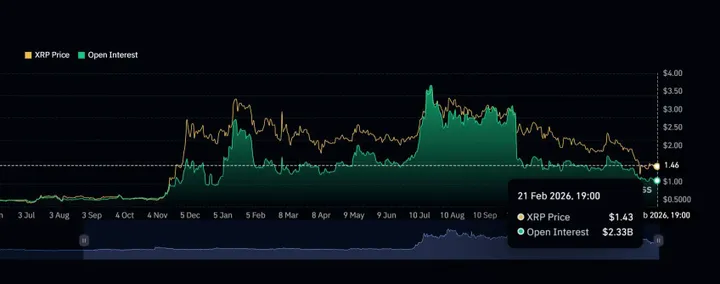 XRP noteert rond de $1,35–$1,38 (met lichte fluctuaties in de laatste dagen), een daling van zo'n 28% sinds begin jaar. Tegelijk daalt de open interest in futures fors – recent rond de $2,3 miljard, maar recente data tonen zelfs niveaus onder de $1 miljard op sommige exchanges, een sterke krimp.