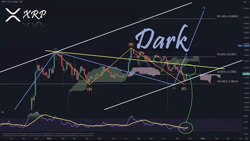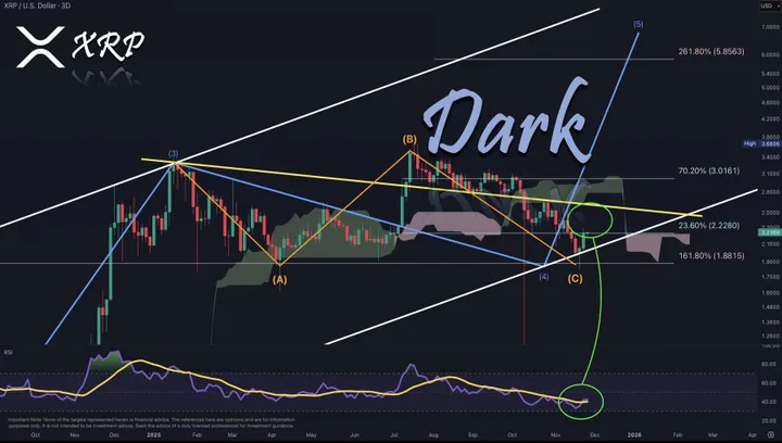 claimt dat XRP zijn maandelijkse Golf 4 eindelijk heeft afgerond. Op zijn chart zie je dat de subgolven binnen die correctieve golf een bodem hebben gevormd tussen grofweg $2,07 en $2,36. Dat gebied werkte als een stevige springplank.