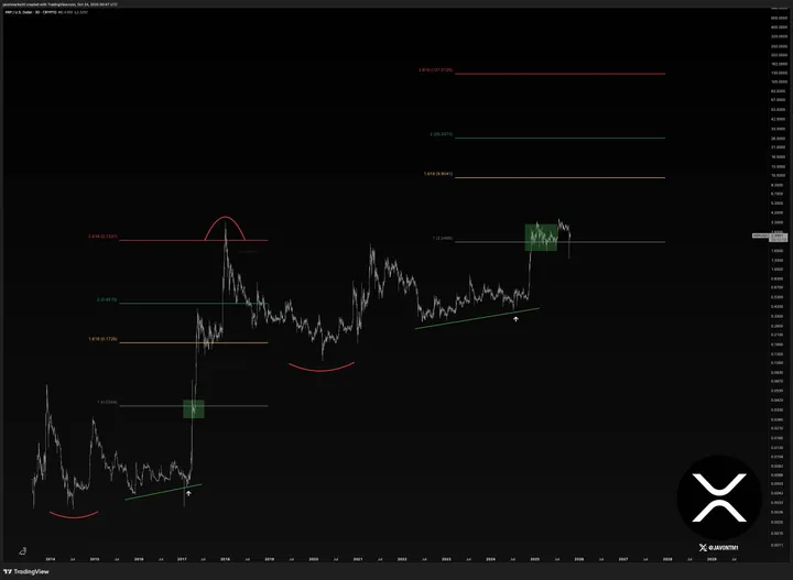 Als dit doorzet, kan XRP naar $9,90 schieten. Dat zou een stijging van zo'n 309% zijn vanaf de huidige niveaus rond $2,40. Indrukwekkend, toch? Hij denkt dat de lopende consolidatie juist de springplank is voor de volgende golf, net als de epische rally van 2017 die XRP naar de all-time high van $3,84 joeg.