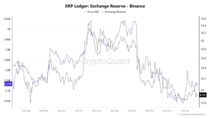 - Exchange reserves op Binance stegen naar ~2,74 miljard XRP (hoogste sinds november 2025), na maanden daling. Dit kan duiden op terugkeer van tokens voor verkoop/distributie – slecht nieuws voor bulls.