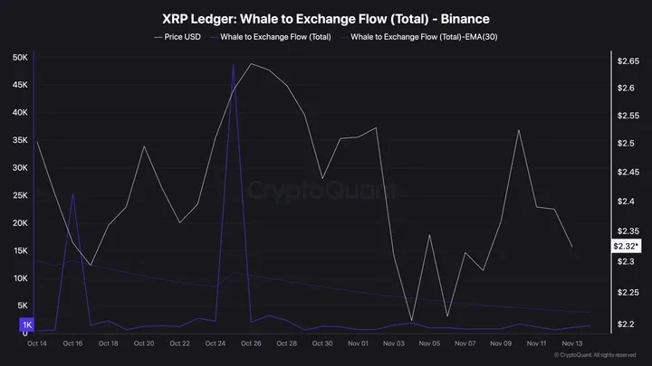 Binance-data bevestigt een afnemende activiteit bij grote wallets. Sinds oktober dalen de overboekingen naar exchanges, met een kortstondige piek op 25 oktober die snel verdampte.
