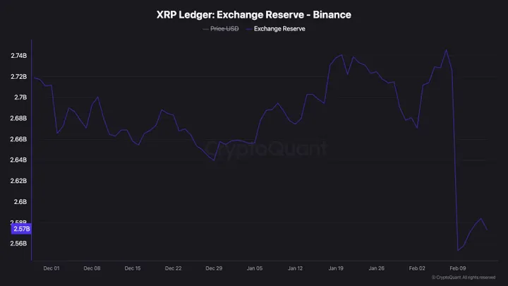 CryptoQuant-data laat een duidelijke trend zien. Tussen 7 en 9 februari verdwenen er 192,37 miljoen XRP van Binance – een daling van 7% in reserves, tot 2,553 miljard tokens. Dat is het laagste niveau sinds januari 2024, en sindsdien blijven de reserves stabiel laag.
