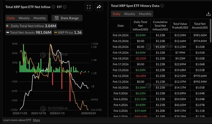 Dit suggereert dat grote vermogensbeheerders en professionele partijen de eerdere koersval aangegrepen hebben als een koopmoment. Terwijl individuele whales mogelijk winst namen of hun posities herstructureerden, bouwden instituties stilletjes verder aan hun belangen. Het totaal beheerde vermogen in XRP-beleggingsproducten kruipt hierdoor gestaag richting de magische grens van 1 miljard dollar.
