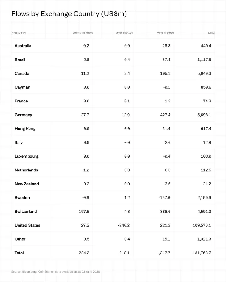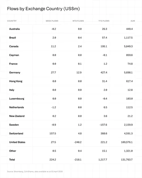 Volgens de data kwam ongeveer 157 miljoen dollar van de totale instroom uit Zwitserland. Duitsland en de Verenigde Staten voegden elk ongeveer 28 miljoen dollar toe, terwijl Canada rond 11 miljoen dollar zat. Dat is geen breed gedragen risk-on beweging. Het is eerder een herstel dat leunt op een beperkt aantal markten.