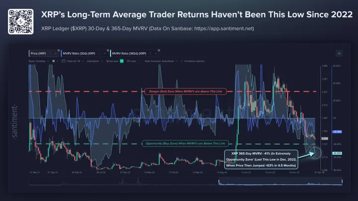 Santiment-data staan XRP-wallets die het afgelopen jaar actief waren gemiddeld ongeveer 41% in de min. Daardoor is de MVRV-ratio teruggevallen naar het laagste niveau sinds de FTX-crash van november 2022. Historisch werd zo’n zone vaker gezien als een gebied waar veel zwakke handen al uit de markt zijn gedrukt en een relief rally mogelijk wordt.