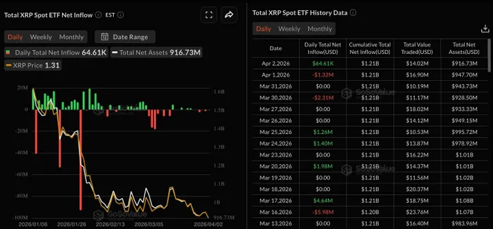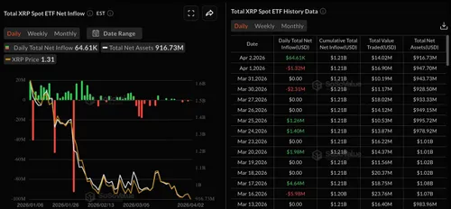 Daar wringt het. Spot XRP-ETF’s zagen donderdag weliswaar een kleine instroom van 64.610 dollar, maar dat volgt op een uitstroom van 31,16 miljoen dollar in maart. Dan kun je moeilijk spreken van een markt die al vol overtuiging terug naar XRP draait.