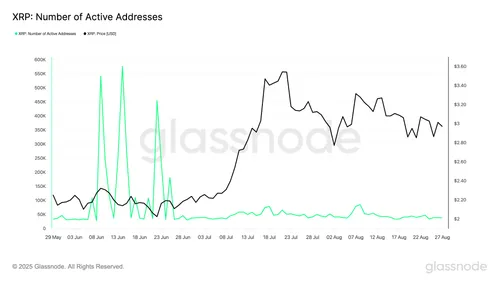 Glassnode’s data schetst een somber beeld: het netwerkgebruik van XRP keldert. Op 27 augustus telde de XRP Ledger slechts 38.303 actieve adressen. Ter vergelijking: in juni piekte dit boven de 500.000.