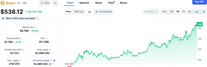 In de laatste 24 uur veerde Zcash op met ruim 18 procent, gemeten vanaf de dip op 6 oktober. Op dit moment noteert de munt rond de 539 dollar, een sprong van 255 procent op maandbasis en een ronduit verbluffende 1600 procent vanaf het dieptepunt dit jaar.