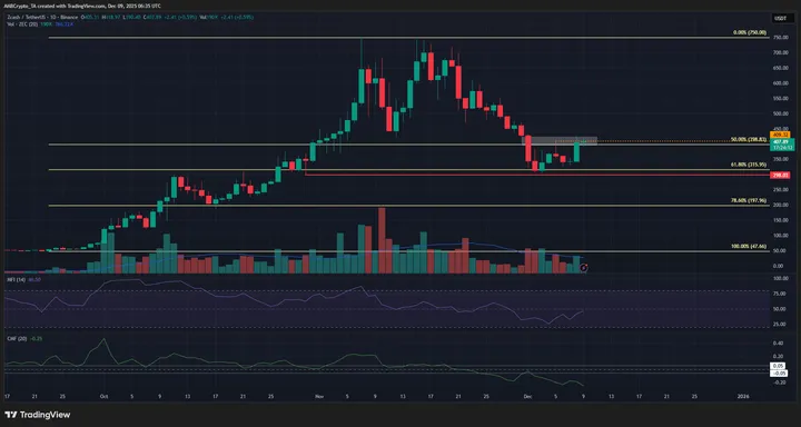 ZEC-land. De privacycoin knalde van $312,80 naar $430,20 – dat is dik 35,8% in nog geen week. De $400 is inmiddels gesloopt en de bulls kijken al reikhalzend uit naar het volgende niveau: $480.