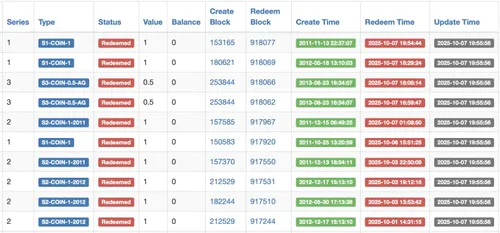 Tegen 19 oktober 2025 zijn 10.193 van de 27.939 geslagen Casascius-munten ingewisseld, met nog 17.746 actieve munten over. Die bevatten 38.051 BTC ($4,14 miljard), terwijl 53.213 BTC ($5,8 miljard) al is bevrijd.