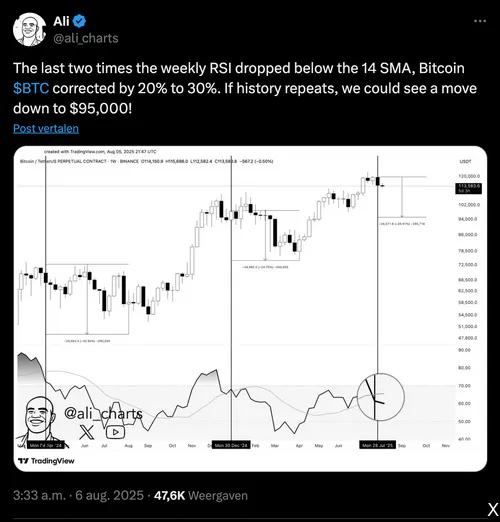 vertelde namelijk aan zijn volgers op X dat Bitcoin in het verleden tweemaal met 20% tot 30% corrigeerde. Dit gebeurde nadat de Relative Strength Index (RSI) op de wekelijkse grafiek onder het 14-periodes voortschrijdend gemiddelde (SMA) viel dat erop is geprojecteerd.