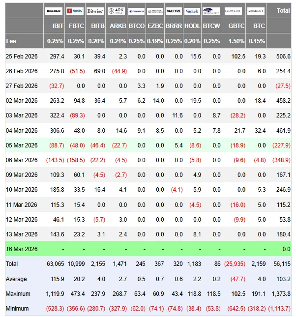 volgens Farside kwamen uit op $167,1 miljoen op 9 maart, $246,9 miljoen op 10 maart, $115,2 miljoen op 11 maart, $53,8 miljoen op 12 maart en $180,4 miljoen op 13 maart. Daarmee eindigde een week waarin de ETF-markt geen enkele netto uitstroomdag kende.