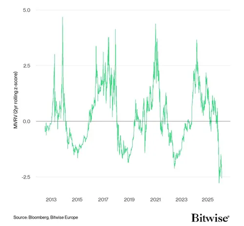 Weekly Crypto Market Compass staat de tweejarige MVRV z-score op het laagste niveau ooit – een klassiek signaal van onderwaardering.