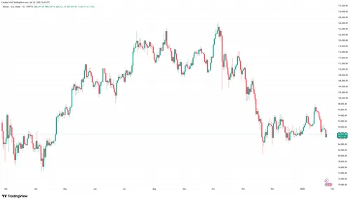 goud feestviert, sukkelt Bitcoin rond de $86.000–$87.000 (met dips naar lager). Dat is een flinke stap terug ten opzichte van de pieken eind vorig jaar – zo'n 30% lager dan het hoogtepunt in oktober 2025.