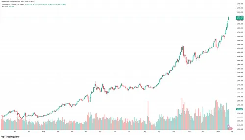 Maandag schoot de goudprijs omhoog en tikte een piek aan van rond de $5.110 per ounce, nadat het eerder al boven de $5.000 was gesprongen. Dat is een absoluut record, nog nooit eerder gezien.