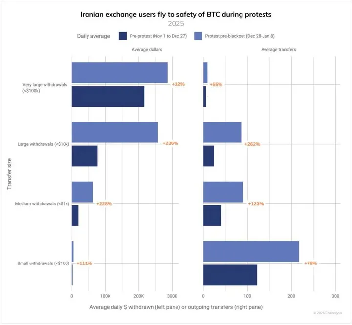 Bitcoin in sneltreinvaart van lokale exchanges naar persoonlijke wallets. Dit gebeurde vooral tussen eind december 2025 en 8 januari 2026, vlak voor de landelijke internetblokkade werd ingesteld.