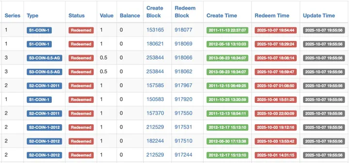 De meeste waren 1 BTC koperen munten uit de Series 1, 2 en 3 (2011-2013), maar ook twee zilveren S3-COIN-0.5-AG munten uit augustus 2013 werden geclaimd. Alle tien staan nu officieel als ‘ingewisseld’ met een lege wallet.