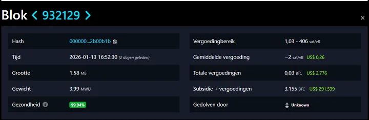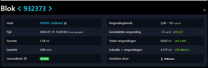 Slechts twee dagen eerder, op dinsdag 13 januari, gebeurde het al eens: een andere solo-miner mineerde een blok en verdiende rond de $295.000 (ongeveer 3,155-3,16 BTC). Pure loterij-winnaars in de Bitcoin-wereld!