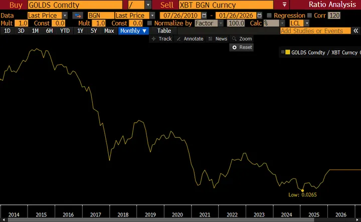 BTC/goud-ratio (hoeveel goud je voor 1 BTC krijgt). Goud is de teller, Bitcoin de noemer – een dalende lijn betekent dat goud bijna al zijn relatieve waarde heeft verloren tegenover Bitcoin.