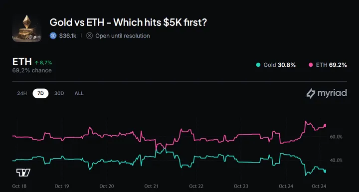 De Myriad-markt zet 65,5% in op ETH die als eerste $5.000 haalt. Waarom? Snelheid boven zekerheid. ETH’s lagere marktkapitalisatie en hogere volatiliteit maken een snelle sprint mogelijk.