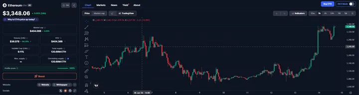 Ondanks al deze groei blijft Ethereum stabiel boven de $3.000. Op dit moment noteert ETH rond $3.310-$3.320, met een mooie plus van meer dan 6% in de laatste 24 uur. Op weekbasis zit er zo'n 2-3% winst in.