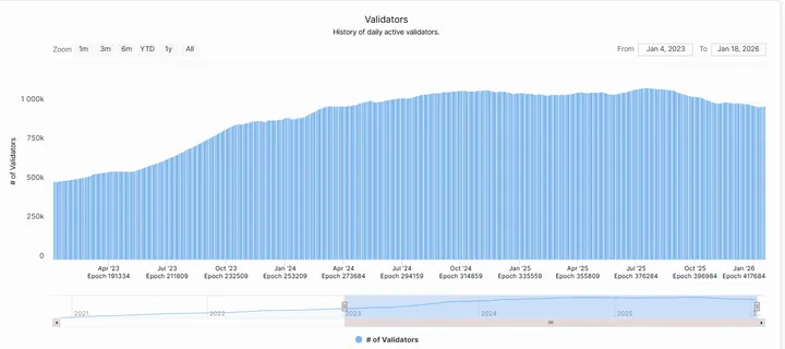 aantal actieve validators: dat schommelt nu tussen 977.000 en 1,04 miljoen – een flinke stap omhoog ten opzichte van ~890.000 eind 2023.