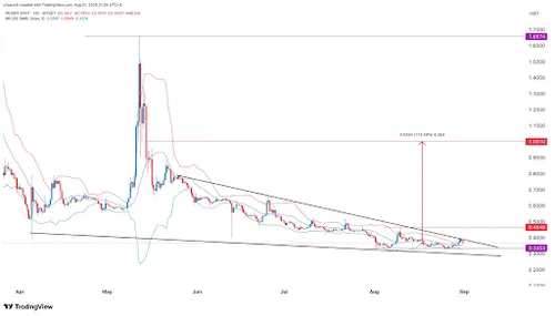 Pi Network handelt rond de $ 0,343, met een marktkapitalisatie van $2,7 miljard. Dit is ver onder de piek van bijna $ 3 eerder dit jaar, maar het project heeft nog steeds een loyale wereldwijde community en een unieke, op mobiel gerichte aanpak die het in de schijnwerpers houdt. Pi begint tekenen van een opleving te vertonen. Analisten hebben een dubbele bodem rond $0,335 en een dalend wigpatroon opgemerkt, wat vaak wijst op een prijsstijging. Als Pi boven de $ 0,40 uitbreekt, zou het op korte termijn kunnen stijgen naar $0,45 of zelfs $0,50.