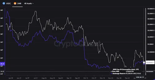 blijkt dat tussen 16 januari en vandaag 361 miljard SHIB van gecentraliseerde beurzen zijn verdwenen, wat een opmerkelijke krimp van het zichtbare aanbod betekent. Afgelopen vrijdag bedroegen de totale SHIB-reserves op beurzen 82,642 biljoen, met een koers van ongeveer $0,00000856.