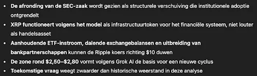 XRP in 2026 kan staan. Waar GPT-5 uitgaat van een gematigd scenario met beperkte upside, schetst Grok AI een veel agressiever koerspad richting $10. Het verschil zit niet in één datapunt, maar in hoe beide modellen Ripple's rol binnen het financiële systeem inschatten. De rol van AI in crypto is een van de grootste trends voor 2026 in finance.