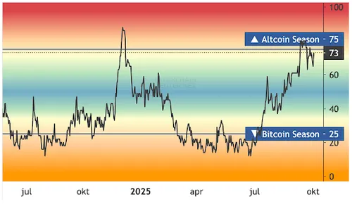 In een altseason zijn er altijd wel een aantal altcoins die indruk weten te maken. Een investeerder die in het juiste project investeert kan hierdoor binnen korte tijd flinke winsten realiseren. De altcoin season bevindt zich nu op 73. Bij 75 is er officieel al sprake van een altseason.