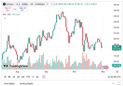 Solana heeft zijn opwaartse trend vastgehouden en werd verhandeld voor $186,17 en een marktkapitalisatie van $102,79 miljard. Beleggers zijn nog steeds optimistisch over de virtuele valuta, ondanks een daling van het handelsvolume met 28,67%.