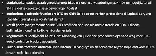 Deze vijf punten vormen samen het framework waarmee ChatGPT tot verschillende scenario's komt per coin. De analyse toont dat elk asset een andere risico-rendement verhouding heeft.