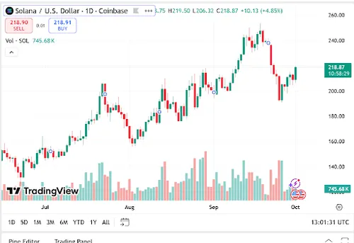 Solana handelt op $218,90, een stijging van 5,61% over de afgelopen 24 uur, met een marktkapitalisatie van $118,41 miljard en $8,16 miljard aan dagelijkse handel, een duidelijk teken van sterke liquiditeit op gecentraliseerde beurzen.