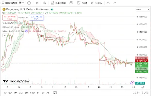 Dogecoin wordt momenteel verhandeld voor $0,1240. De prijs is met 0,53 procent gedaald. De marktkapitalisatie bedraagt momenteel $20,91 miljard.