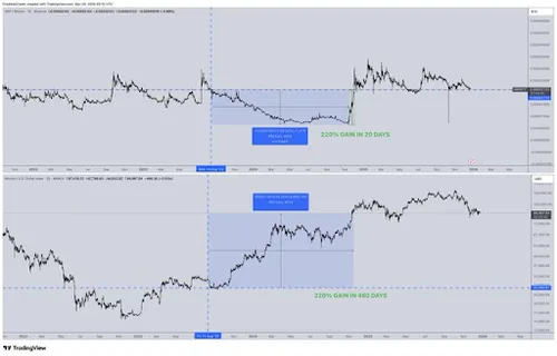 De transactiegeschiedenis van XRP ten opzichte van Bitcoin heeft tijdens de huidige cyclus hernieuwde aandacht gekregen. Het XRP/BTC-paar daalde meer dan 460 dagen gestaag. Gedurende deze periode presteerde XRP minder goed dan Bitcoin en bleef het marktsentiment zwak.