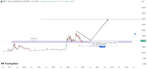 Ondertussen gelooft Xauluax dat XRP uiteindelijk zijn vorige all-time high van rond de $3,84 kan overtreffen, die het in 2025 niet wist te heroveren, terwijl andere topactiva nieuwe pieken bereikten. Hij verwacht niet dat die verschuiving van de ene op de andere dag zal plaatsvinden, maar hij ziet de huidige prijsrange wel als een basis voor een toekomstige stijging.