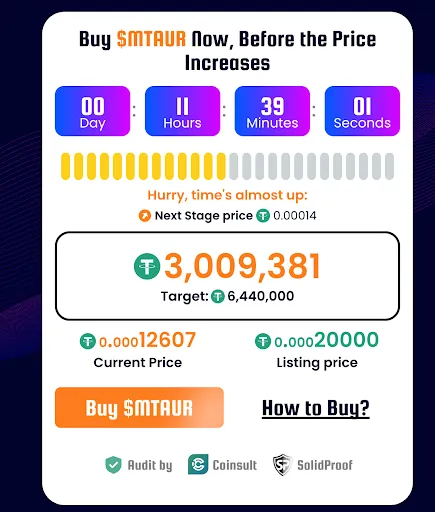 - Momenteel kan men met 50 USDT ongeveer 400.000 MTAUR-tokens kopen.
