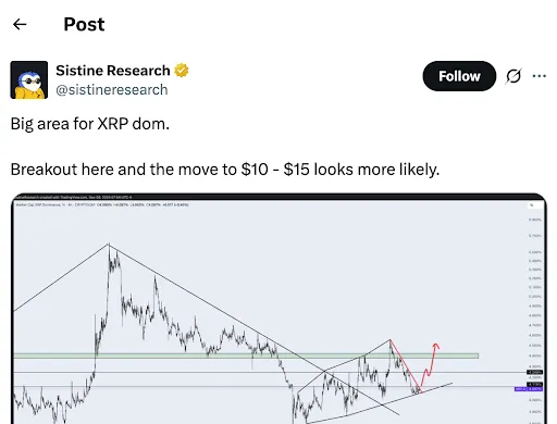 Sistine Research suggereerde onlangs dat XRP "gemakkelijk" de $10-$15 zou kunnen bereiken als de marktdominantie een belangrijk weerstandsniveau doorbreekt en stijgt van 4% naar 4,5%.