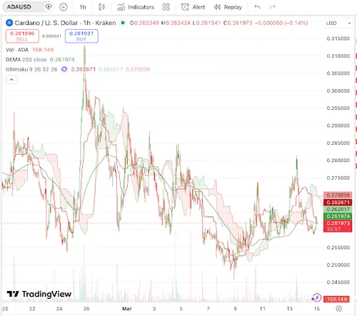 Cardano wordt momenteel verhandeld op $0,2619, een daling van 1,06% op de dag. Het heeft een marktkapitalisatie van $9,45 miljard en een handelsvolume van $371,55 miljoen, een stijging van 41%. Het is interessant om op te merken dat het handelsvolume toeneemt in een periode waarin de markten over het algemeen zwak zijn.