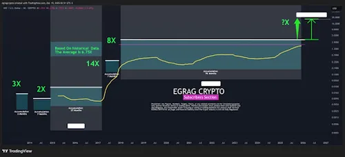 XRP heeft nu ongeveer 96 maanden geconsolideerd sinds de hoogste koers ooit van $3,84 in januari 2018. Op basis van deze geschiedenis benadrukte Egrag Crypto een gemiddelde expansie na een breakout van ongeveer 6,75 keer.
