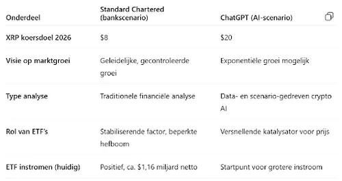 XRP loopt sterk uiteen tussen Standard Chartered die een conservatieve voorspelling van $8 tegen het einde van 2026 uitbracht, terwijl ChatGPT een veel optimistischer scenario schetst.