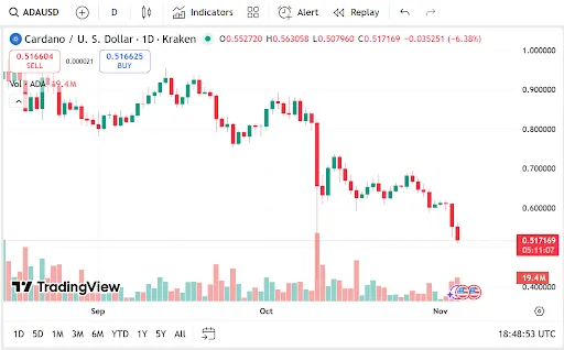 ADA van Cardano noteert $0,5166, een daling van 9,05%, met een marktkapitalisatie van $18,41 miljard en een dagelijks handelsvolume dat met 6,2% stijgt tot $1,47 miljard.