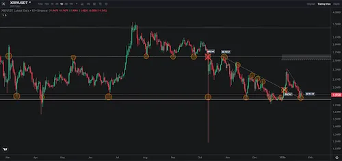 XRP boven $1,80 blijft handelen. Een doorbraak onder dit niveau zou verdere daling kunnen triggeren richting $1,60. Maar als XRP het huidige momentum vasthoudt en $2,20 doorbreekt, komt het vorige record van $3,84 uit 2018 weer in zicht.