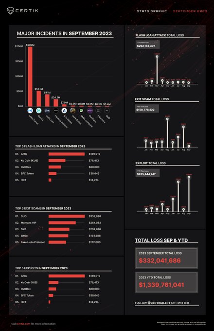 Volgens het cybersecuritybedrijf Certik werden digitale activa ter waarde van ongeveer $332 miljoen gestolen via code-exploits, exit scams en flash-aanvallen alleen al in de maand september. Exploits alleen al waren verantwoordelijk voor meer dan 98% van de diefstallen ($329,8 miljoen), terwijl het bedrag gestolen via flash loan-aanvallen en rug pulls minder dan $2,4 miljoen bedroeg.