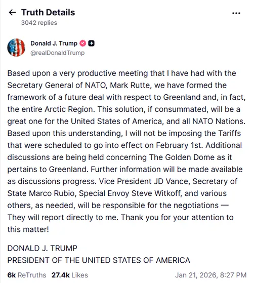 “Na een zeer productieve ontmoeting met NAVO-secretaris-generaal Mark Rutte hebben we de basis gelegd voor een toekomstige overeenkomst over Groenland en, in feite, de gehele Arctische regio."